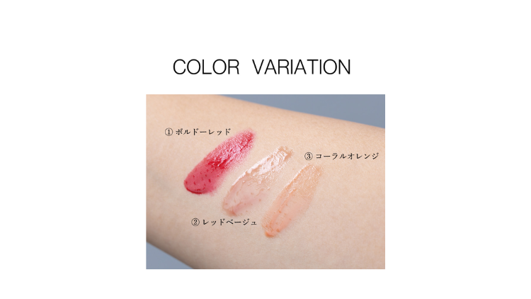 トリ(カプリル酸/カプリン酸)グリセリル(ヤシ)、オリーブ果実油(オリーブ)、ホホバ種子油(ホホバ)、イソステアリン酸水添ヒマシ油(トウゴマ)、ダイマージリノール酸ダイマージリノレイル(菜種、ひまわり)、トリ酢酸テトラステアリン酸スクロース(ショ糖)、パルミチン酸デキストリン(ヤシ)、キャンデリラロウ(キャンデリラ)、カルナウバロウ(カルナウバ)、ミツロウ(蜜蝋)、トコフェロール(大豆)、+/-トリイソステアリン酸ポリグリセリル-2(ヤシ)、ヒマシ油(トウゴマ)、マイカ(鉱石)、酸化チタン(鉱石)、水酸化Al(鉱石)、シリカ(鉱石)、カルミン(エンジムシ)、酸化鉄(鉄鉱石)、ヒアルロン酸Na(糖)、ローヤルゼリーエキス(ローヤルゼリー)、スクワラン(オリーブ)、アルブチン(コケモモ)、イソステアロイル加水分解コラーゲン(魚)、イソステアリン酸(ヤシ)、プラセンタエキス(豚)、加水分解エラスチン(魚)、加水分解コラーゲン(魚)、セレブロシド(馬)、アルニカ花エキス(アルニカ)、シナノキエキス(シナノキ)、スギナエキス(スギナ)、オトギリソウエキス(オトギリソウ)、セージエキス(セージ)、セイヨウノコギリソウエキス(セイヨウノコギリソウ)、ゼニアオイエキス(ゼニアオイ)、カミツレ花エキス(カミツレ)、トウキンセンカ花エキス(トウキンセンカ)、月見草油(月見草)、リン酸アスコルビルMg(とうもろこし)、ジパルミトイルヒドロキシプロリン(ヤシ)、ウラボシヤハズエキス(海藻)、ツボクサエキス(ツボクサ)